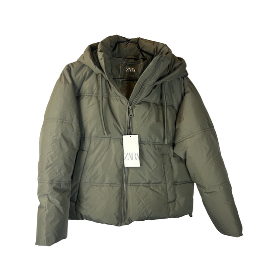 Women’s Short Water-Repellent Windproof Puffy Jacket with Hood – Size S – Dark Olive Green