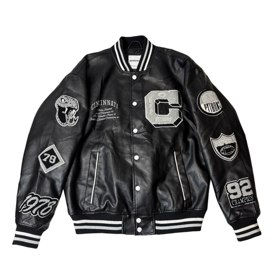 Men’s Black Leather-Effect Varsity Bomber Jacket – Size XS
