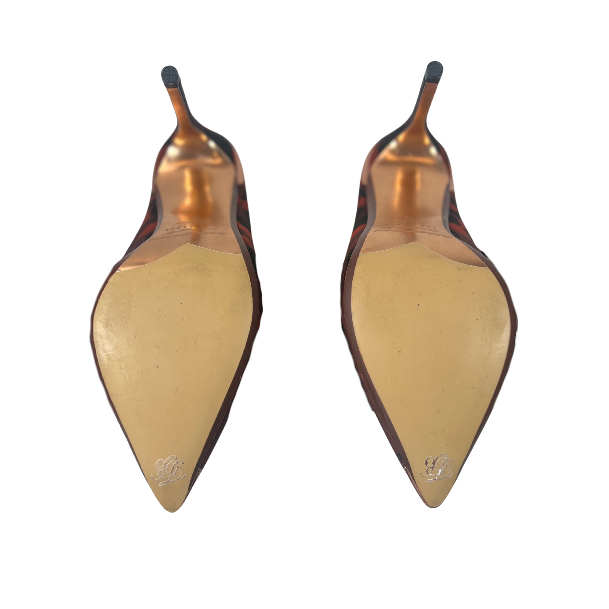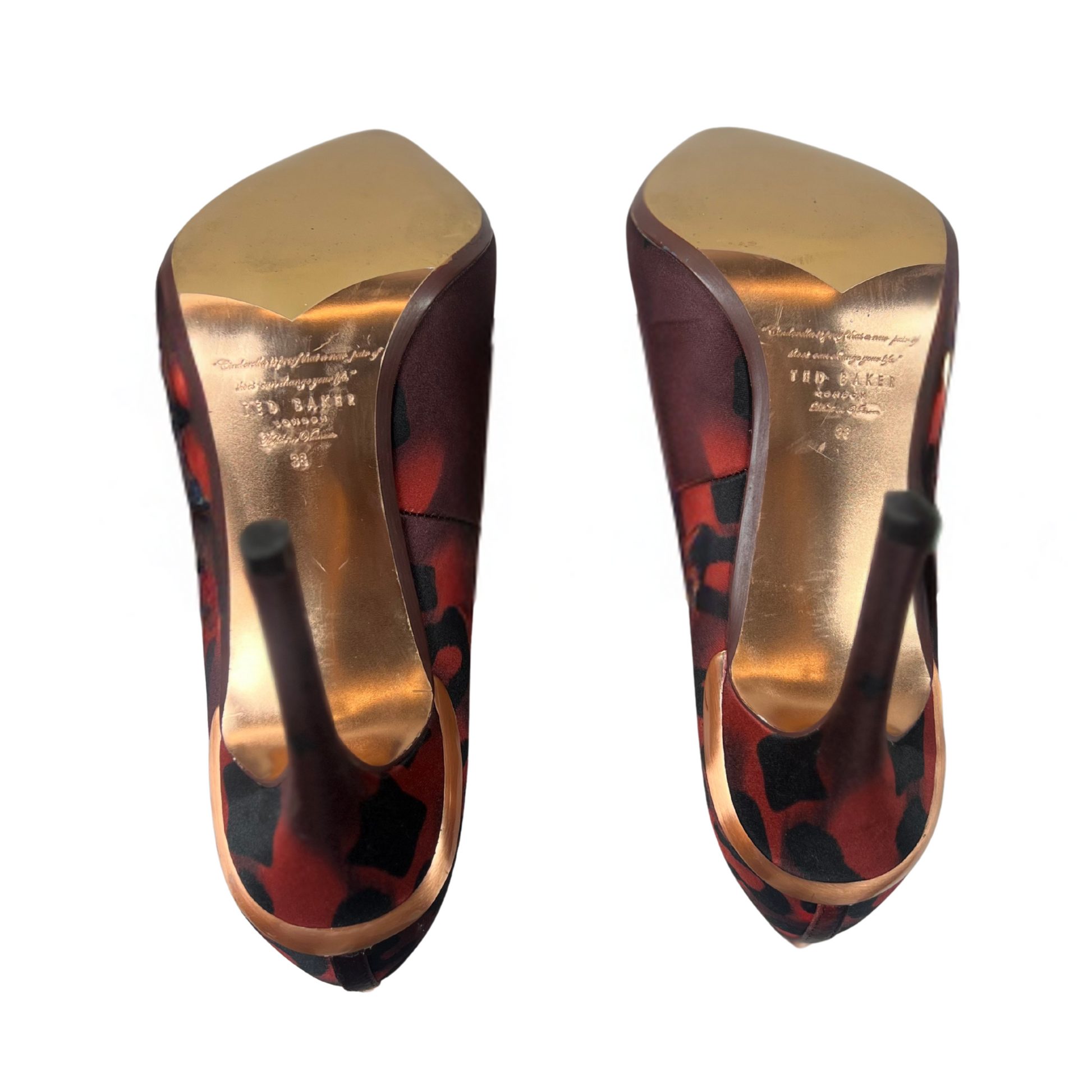 Add a bold touch to your wardrobe with these women’s red satin pumps in size 38. Designed with a pointed toe and 4” stiletto heel, these slip-on shoes feature dark red satin with black animal print and star accents for a fun, stylish look. Pre-loved and in good condition, with light signs of wear. Perfect for nights out, special events, or adding flair to everyday outfits.
