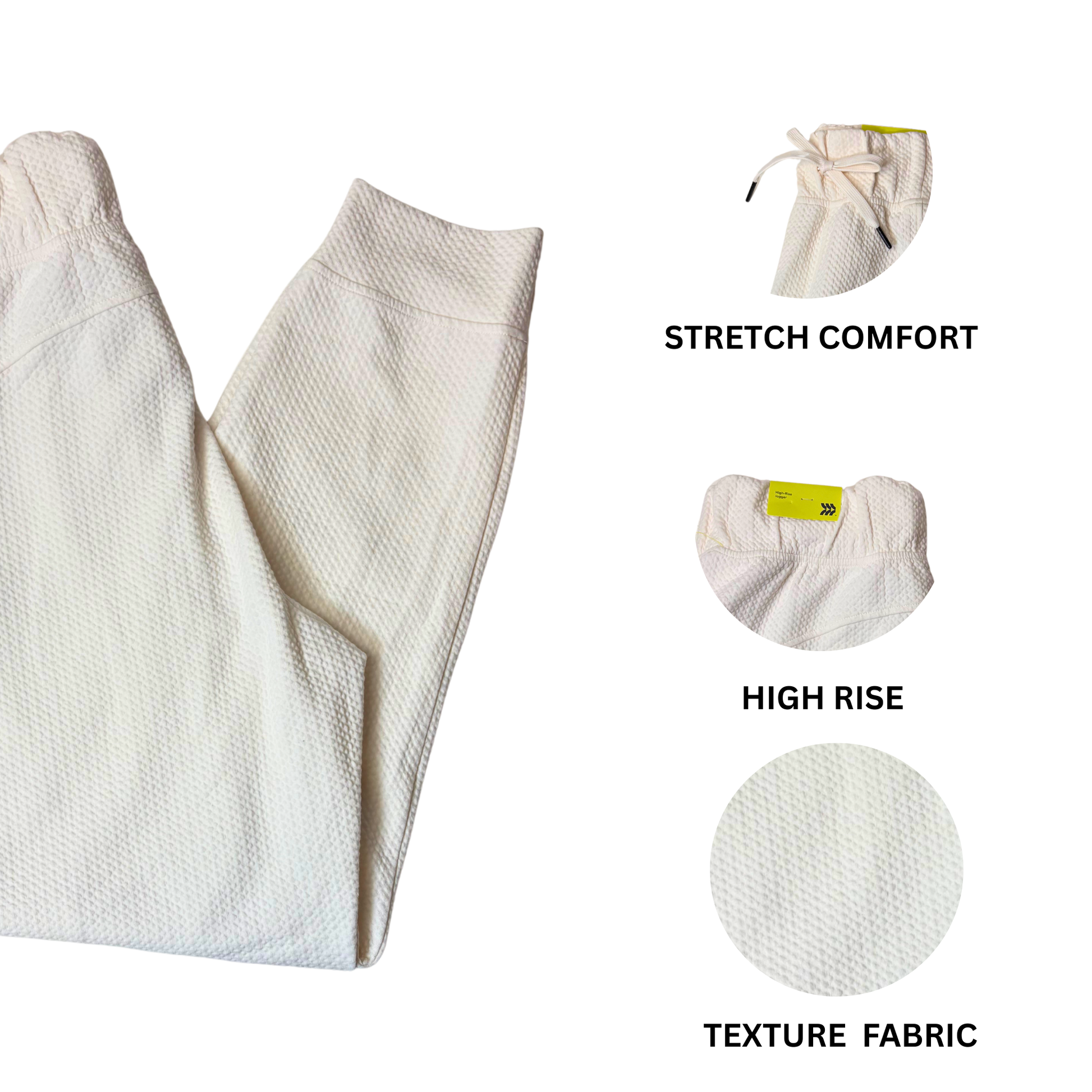Cozy meets stylish in these cream textured joggers, perfect for everyday comfort or laid-back looks. Made with a recycled poly-cotton blend and a hint of stretch, they offer a soft feel and relaxed fit ideal for lounging, errands, or casual outings.