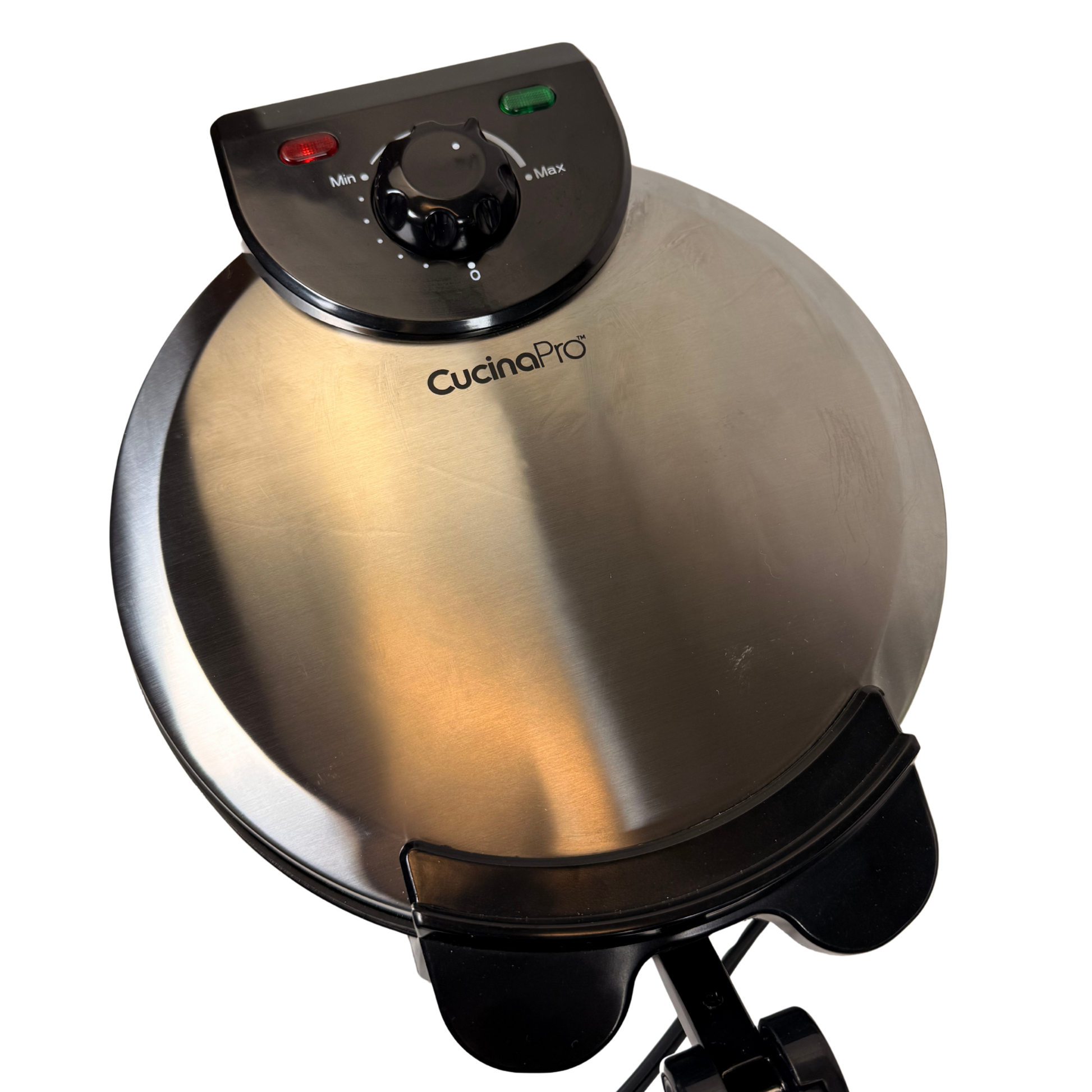 Create perfect 10” tortillas, pitas, and rotis in minutes. Features heavy-duty non-stick plates for even heat, easy cleanup, and upright storage—ideal for homemade tacos, gyros, and more.