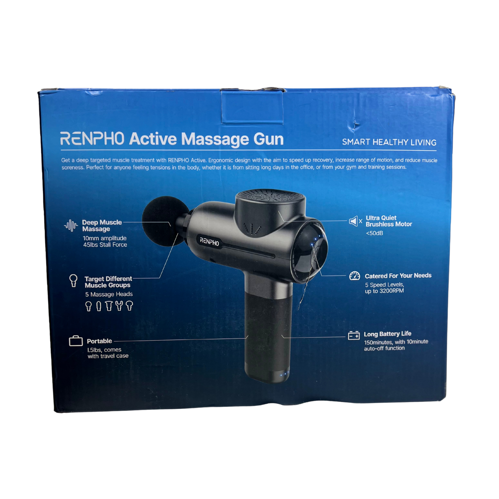 Compact percussion massage gun with quiet motor, 5 speed levels, 5 interchangeable heads, USB-C charging, and ergonomic grip. Ideal for athletes, recovery, and daily relaxation.