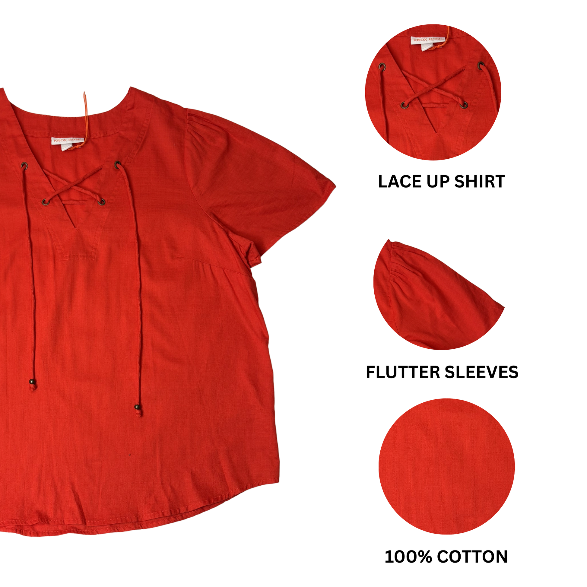 Bright and feminine, this women’s orange short sleeve shirt features stylish flutter sleeves and a lace-up V-neck design. Made from 100% cotton, it offers breathable comfort with a flattering and trendy look.