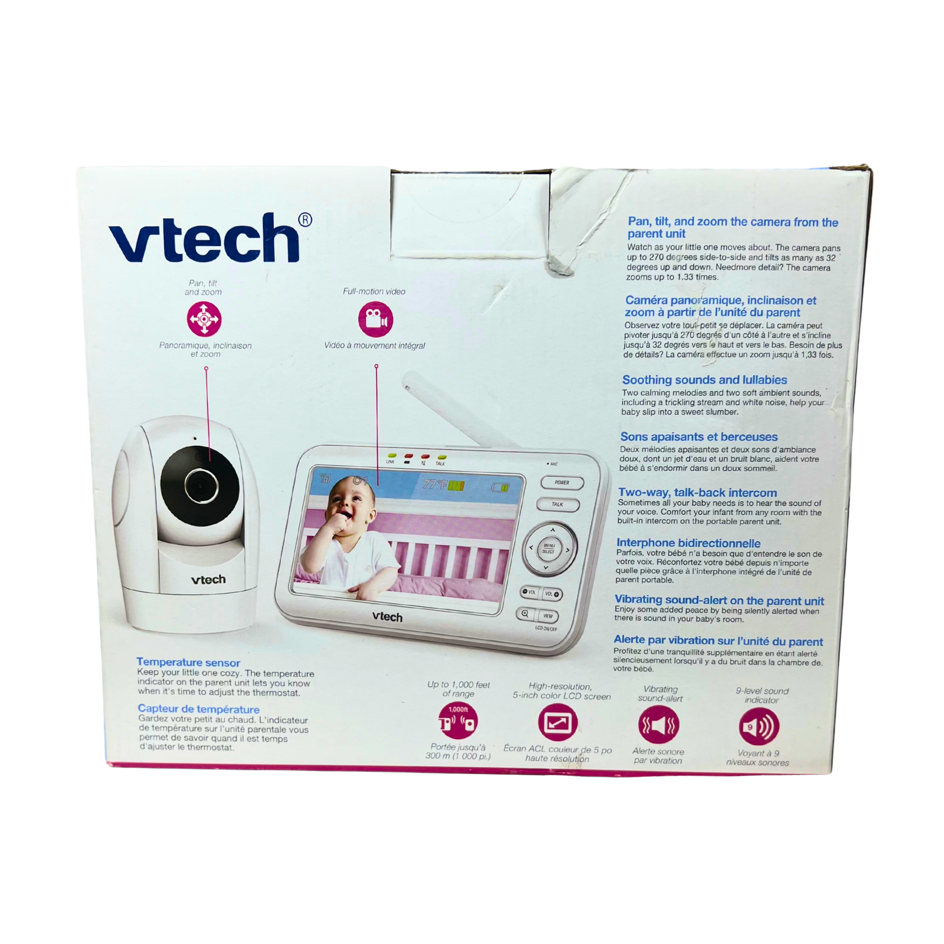 Stay connected with your little one using a 5" color LCD baby monitor featuring long-range coverage, 360° pan and tilt camera, night vision, lullabies, two-way talk, and temperature sensor for peace of mind.
