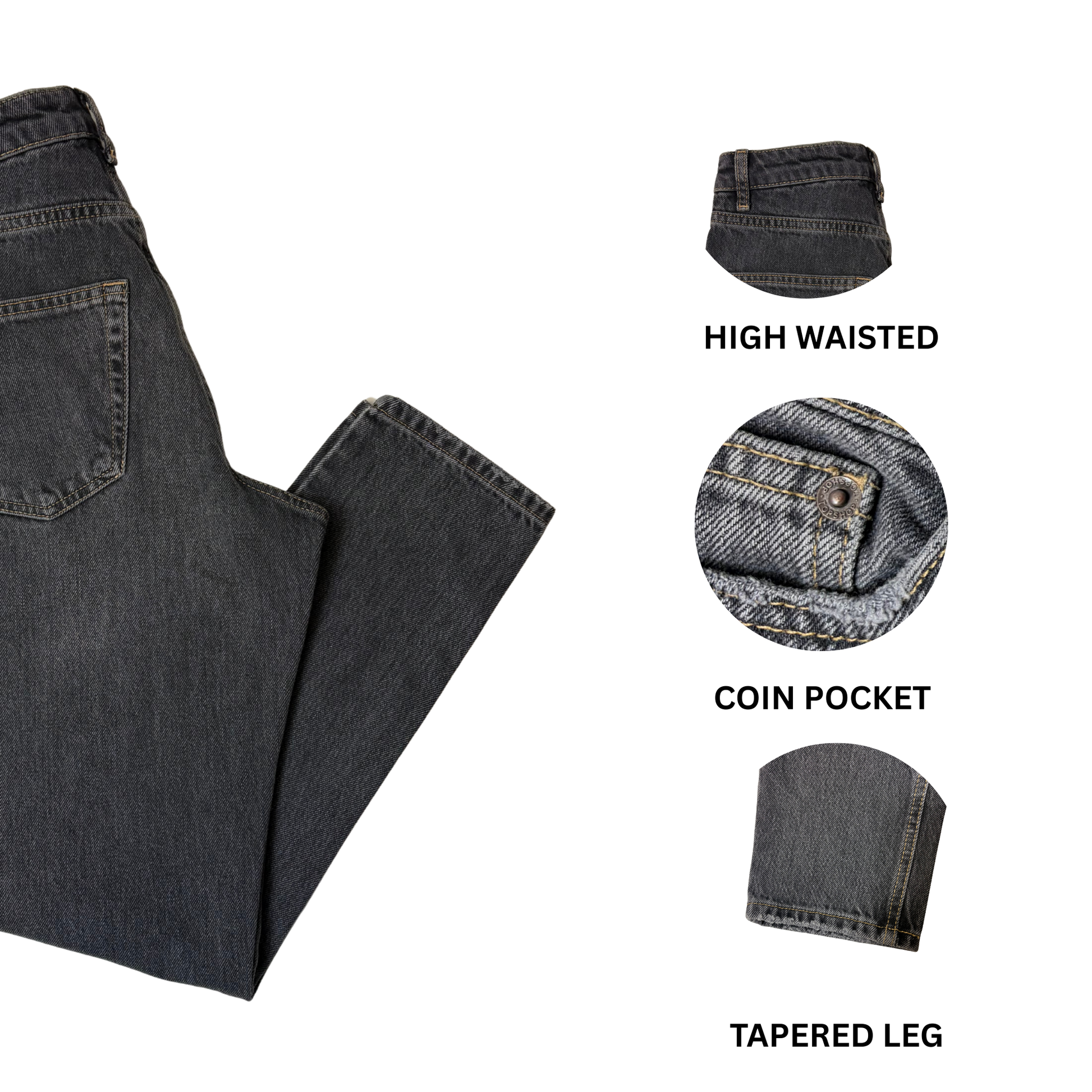 Women’s high-waisted black wash jeans designed for a flattering fit and everyday comfort. A versatile wardrobe staple for casual or dressed-up looks.
