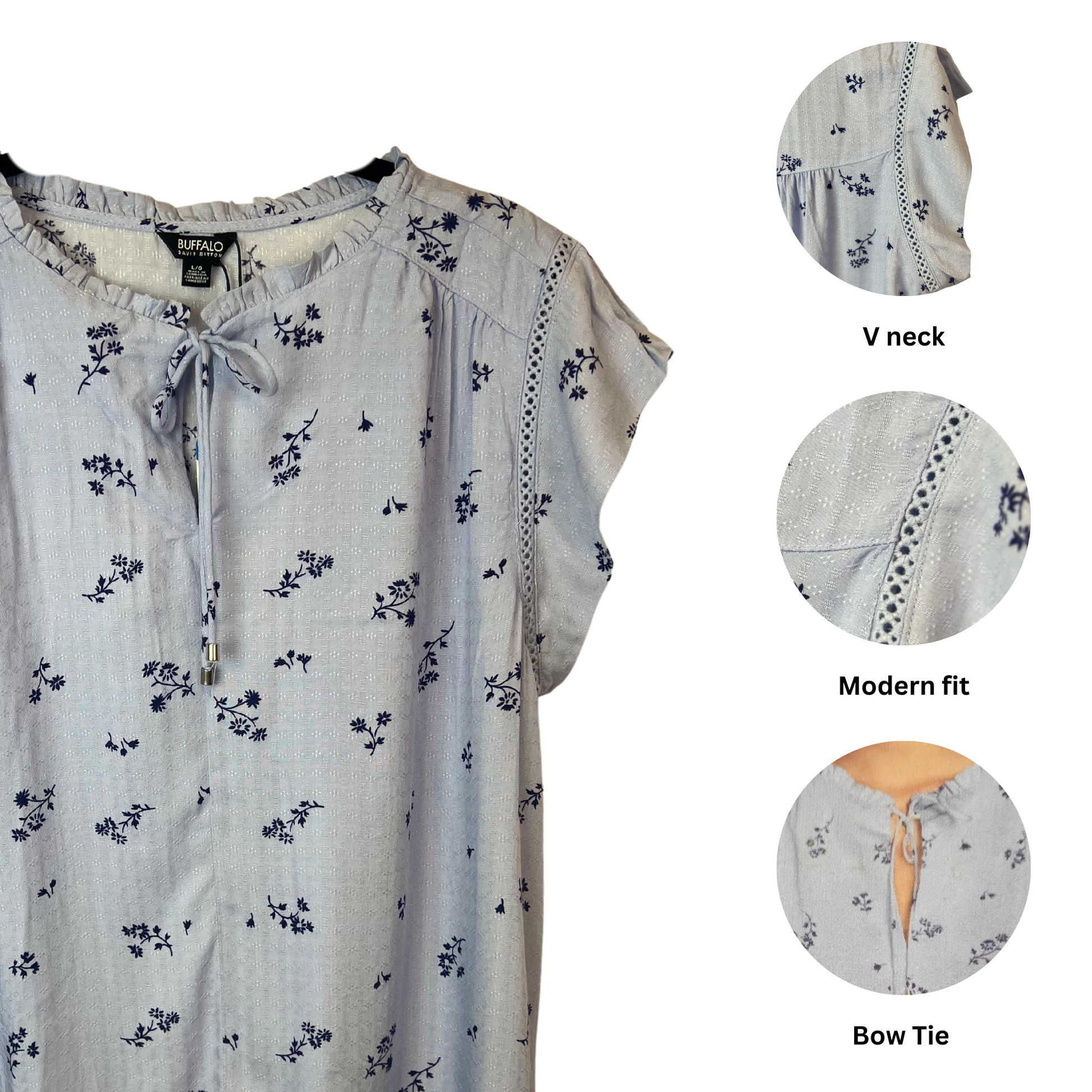 Elevate your summer wardrobe with this women's short sleeve bow tie front shirt in a vibrant blue floral print. Made from 100% viscose, it offers a lightweight and breathable fit. Easy to care for with machine wash in cold water, this stylish top is perfect for any occasion.